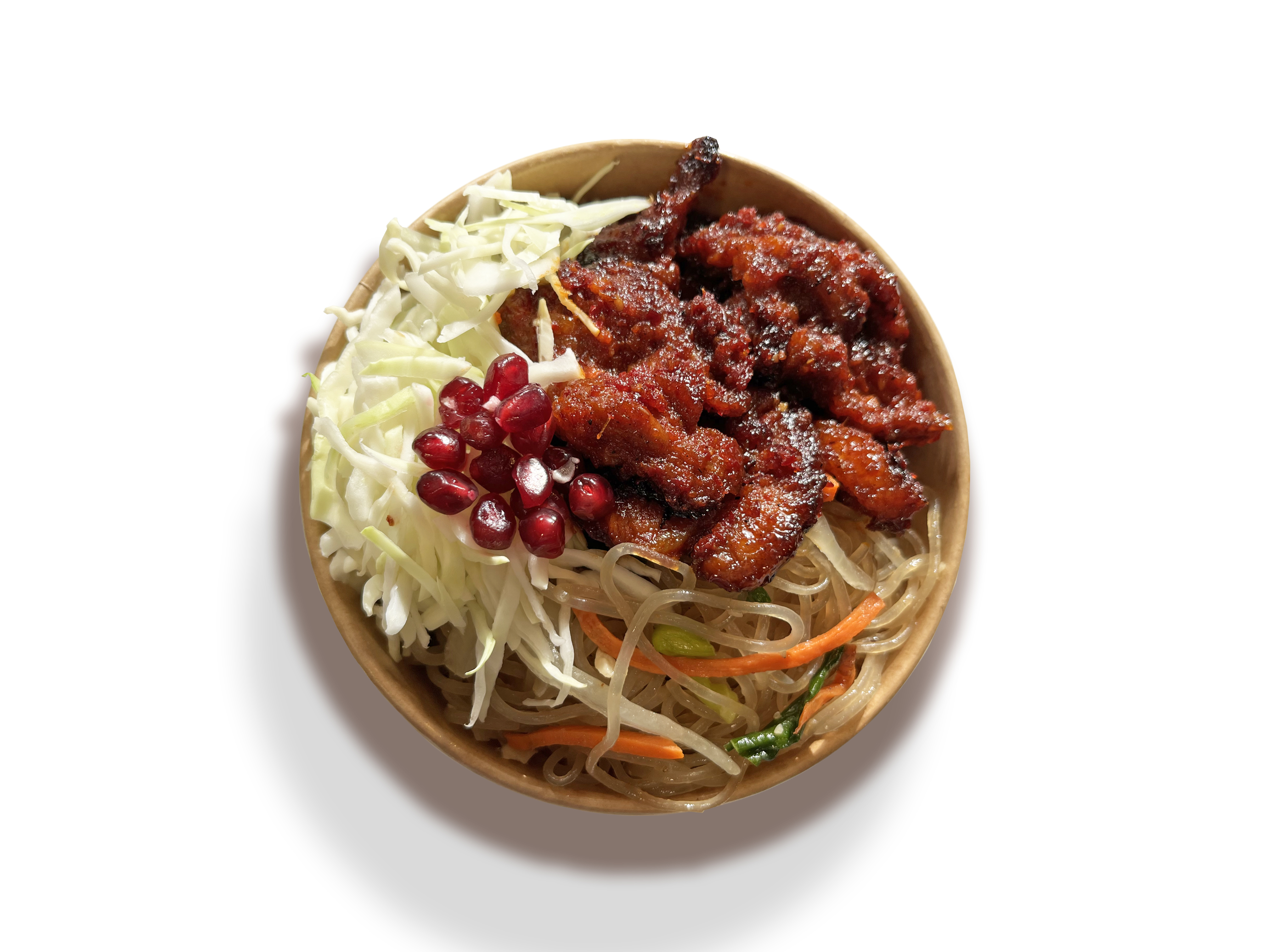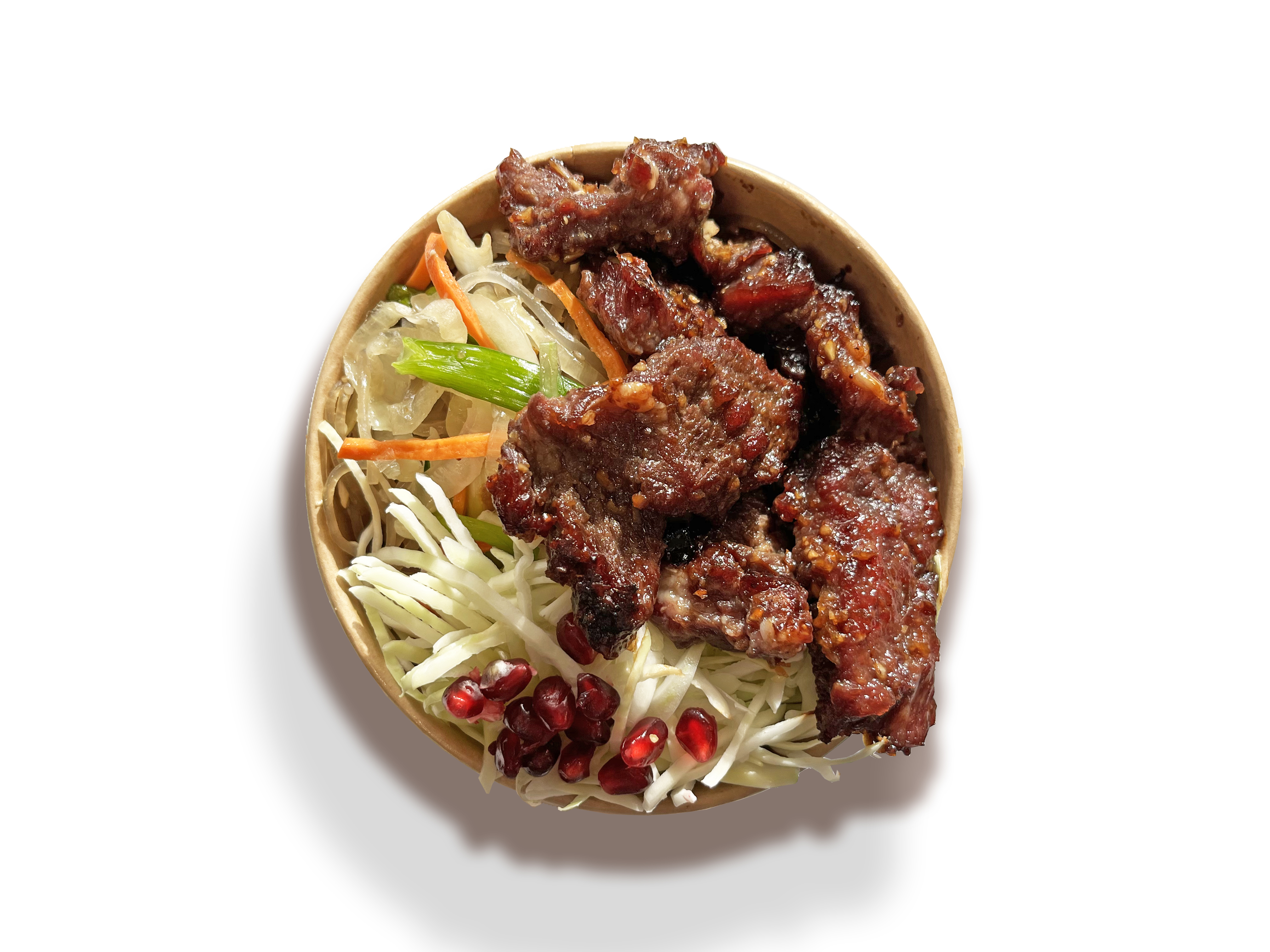 Beef short ribs in our soy-garlic marinade on top of white rice, served with japchae noodles and veggies.
