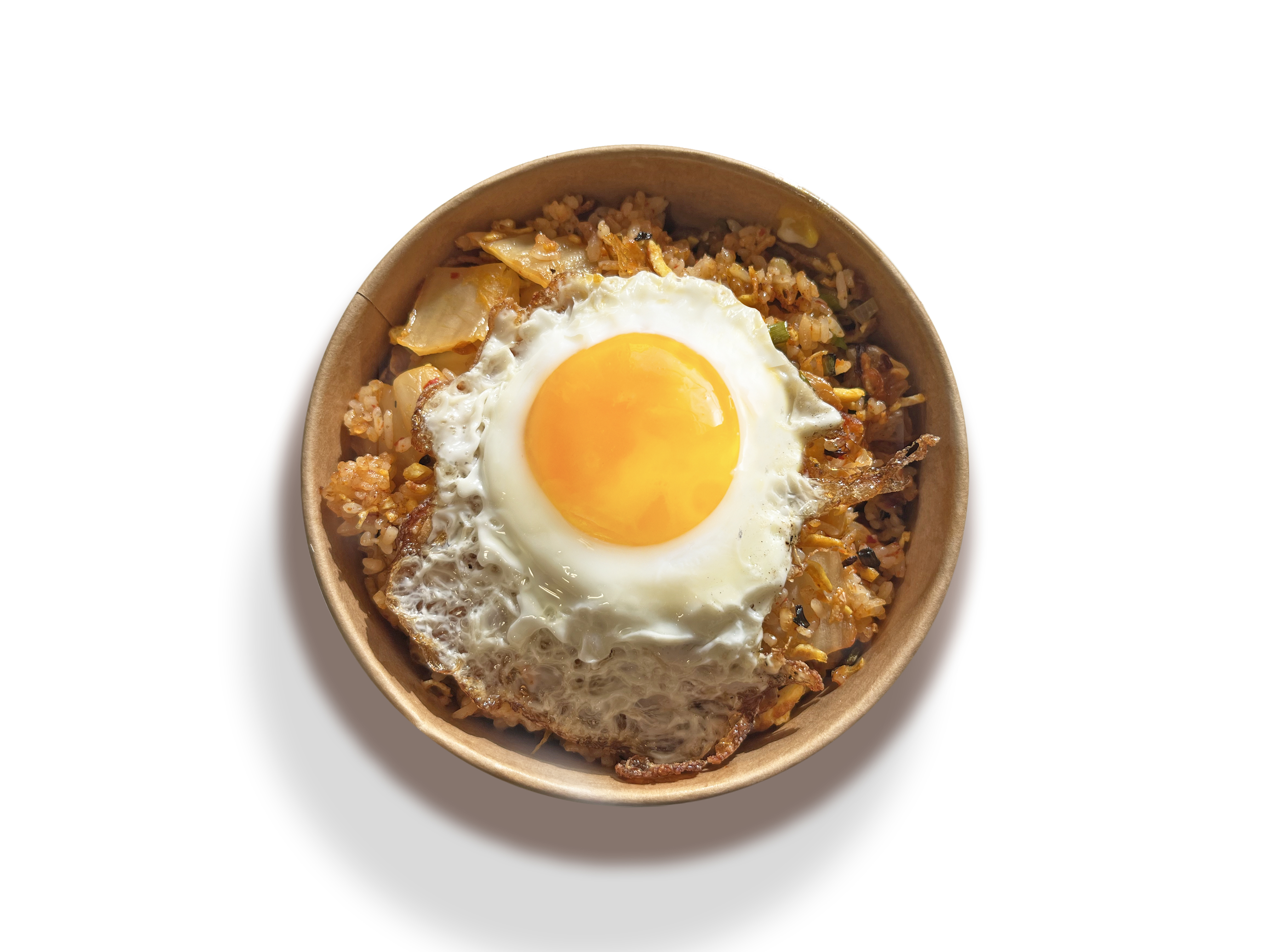 We make our Kimchi fried rice with homemade kimchi, served with an egg on top.
