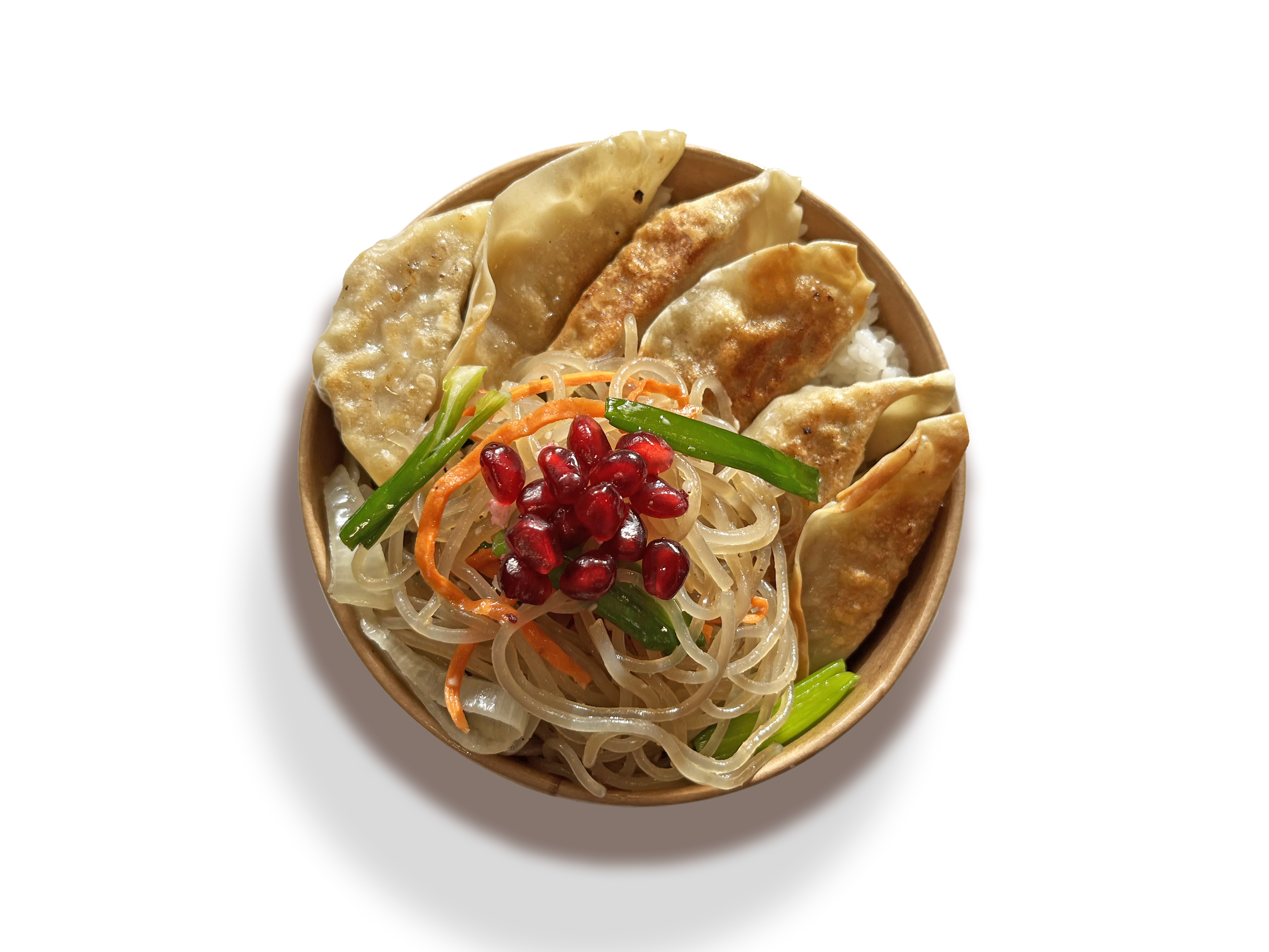 Six veggie dumplings on top of white rice, served with japchae noodles and veggies.